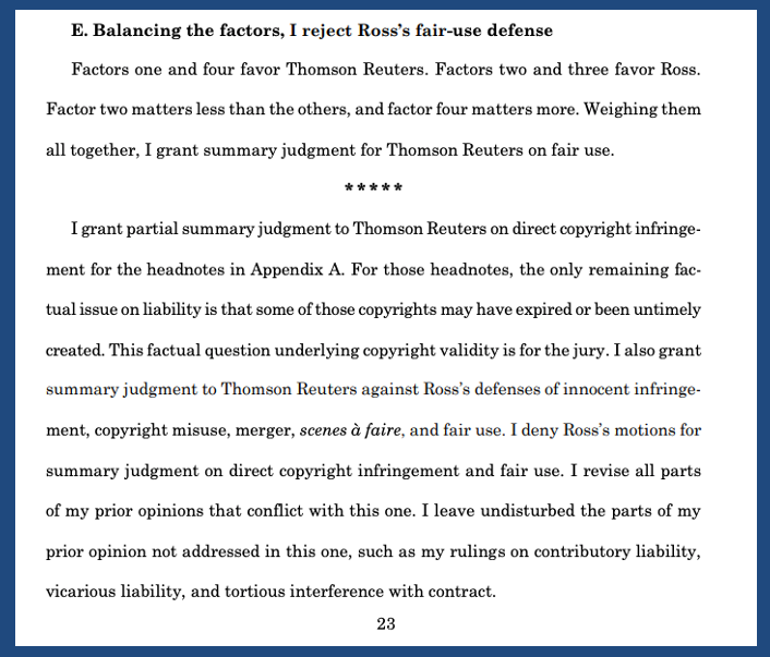 Now comes the first major AI and copyright decision from a US court. Publisher and technology company Thomson Reuters won this potentially landmark AI copyright case against Ross Intelligence in US federal court in Delaware. Ross used Thomson Reuters' "Westlaw" content to train its own competitive AI legal research tool. Ross argued fair use as a defense. The judge rejected most of its arguments, ruling that Ross had improperly infringed on Westlaw’s copyrighted material. A key factor was that Ross sought to create a commercially competitive product. Fair use is a nuanced doctrine and involves the assessment of multiple factors to determine infringement on a case-by-case basis. But the ruling is definitely "bad news" for AI companies with a cavalier attitude toward copyright.