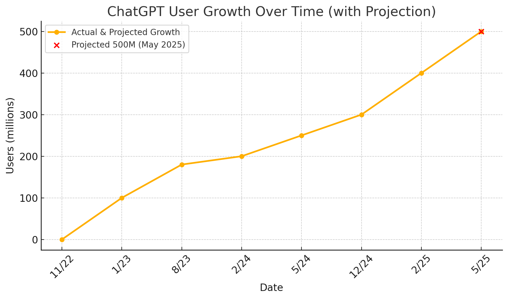 Nobody knows exactly how many users Google Search has. Based on previous company statements, Google boasts seven products "with at least 2 billion monthly users." Those include Search, Chrome, Gmail, Android, YouTube, Maps and Google Play. By comparison, ChatGPT announced "more than 400 million weekly users." As the chart below indicates, it went from none in November 2022 to 200 million by May of last year, and then 300 million in December 2024. It thus appears that ChatGPT's growth is accelerating. If it continues at this pace ChatGPT will reach 500 million users by May if not before. OpenAI's goal is a billion users by the end of 2025, which is aggressive but feasible at current growth rates. OpenAI also announced 2 million paying enterprise customers, roughly doubling since September. Mindful of the direct threat posed by ChatGPT, Google is forcefully using Workspace and Search to try to get people to use Gemini. Google's internal target is 500 million Gemini users by the end of 2025. ChatGPT (and Perplexity) are still delivering a tiny fraction of overall referral traffic to websites and Google's marketshare appears stable. Yet, there's a growing anecdotal sense that Google is losing users, or at least that Search frequency is declining.