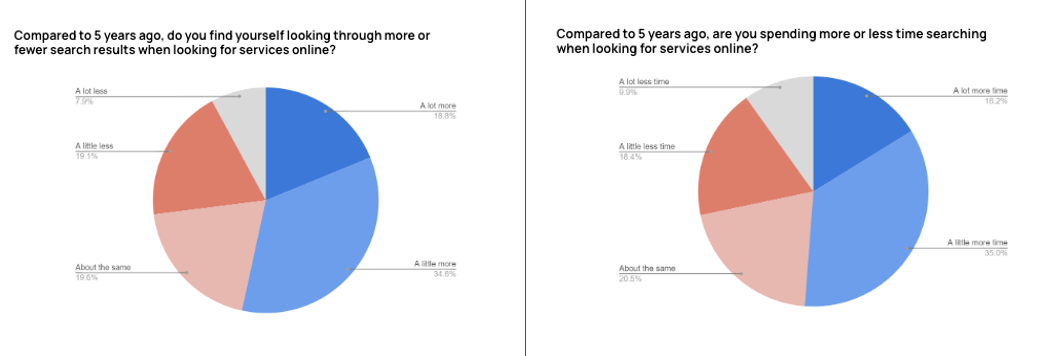 Searchers also express some frustration about the amount of information they must now "filter" in search results. There are more ads, more content types, modules and features than in the past: snippets, local packs, image blocks, product blocks, video, secondary search modules (e.g., People Also Ask), forums and so on. It requires more concentration and discrimination to navigate and separate useful from mediocre content and spam – with lots of clicking back and forth. In other words, search has become less efficient.