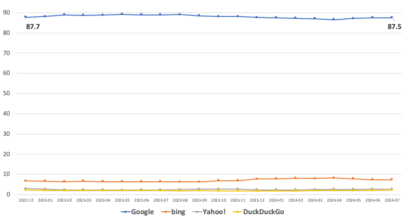 Google's search market share in the US seems to have been stable (~87.5%) since the introduction of ChatGPT. And search volume data from Datos appears to show that Google hasn't lost share in the US or EU and that searches per person are growing, and in May "were at historic highs."