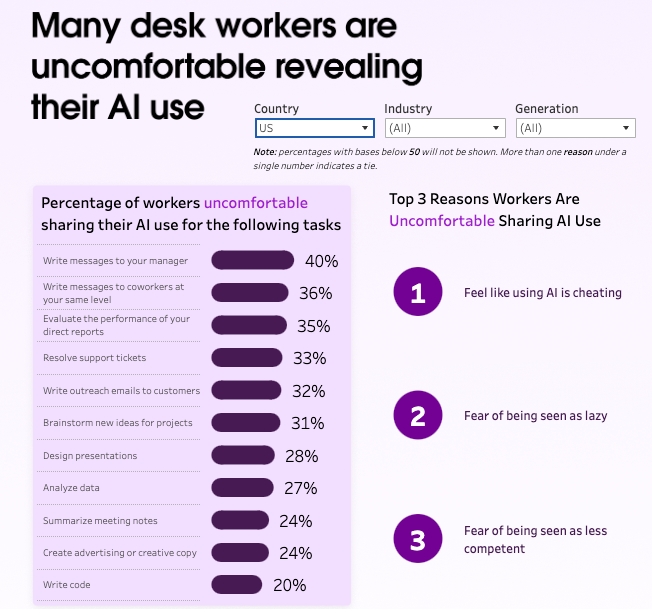 Executives want their employees to be using AI for high-value projects, but many employees are using it to perform routine tasks. And they're feeling guilty, apparently: "it feels like cheating." They don't want to be seen as "less competent" or "lazy." And this is in companies encouraging AI usage or not actively discouraging it. Other "AI blockers" include uncertainty around acceptable AI uses, generational knowledge gaps, fear of job displacement and others.
