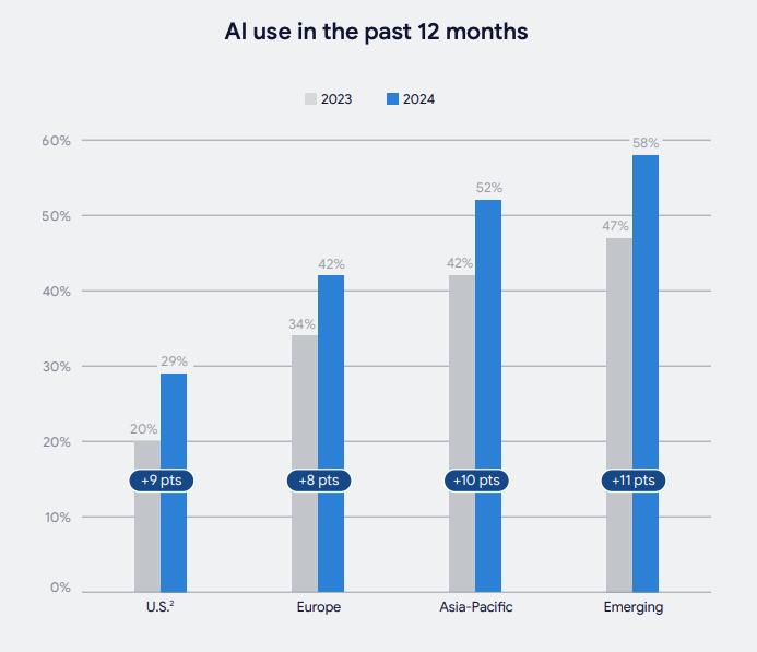The survey found that 48% globally had used generative AI in 2024. The numbers are lower in North America. Dialog's November survey of US consumers found that 44% of US adults had "ever used" generative AI. However the Google report shows 29% for the US adult population. In March 2024, Pew's number was 23%.