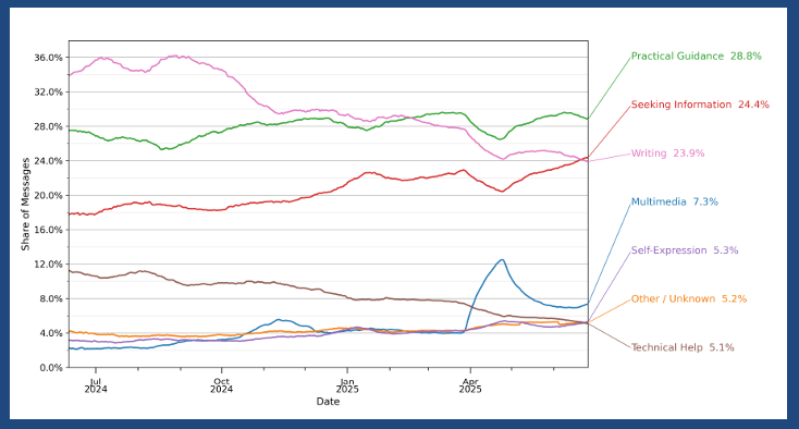 ChatGPT would not be pursuing shopping/product search if it wasn't seeing demand from its audience. Indeed, a report from ChatGPT and the National Bureau of Economic Research confirms this, finding that "Seeking Information" (search-like behavior) is the second most common use for the AI platform, with product research an unquantified subset of that category.