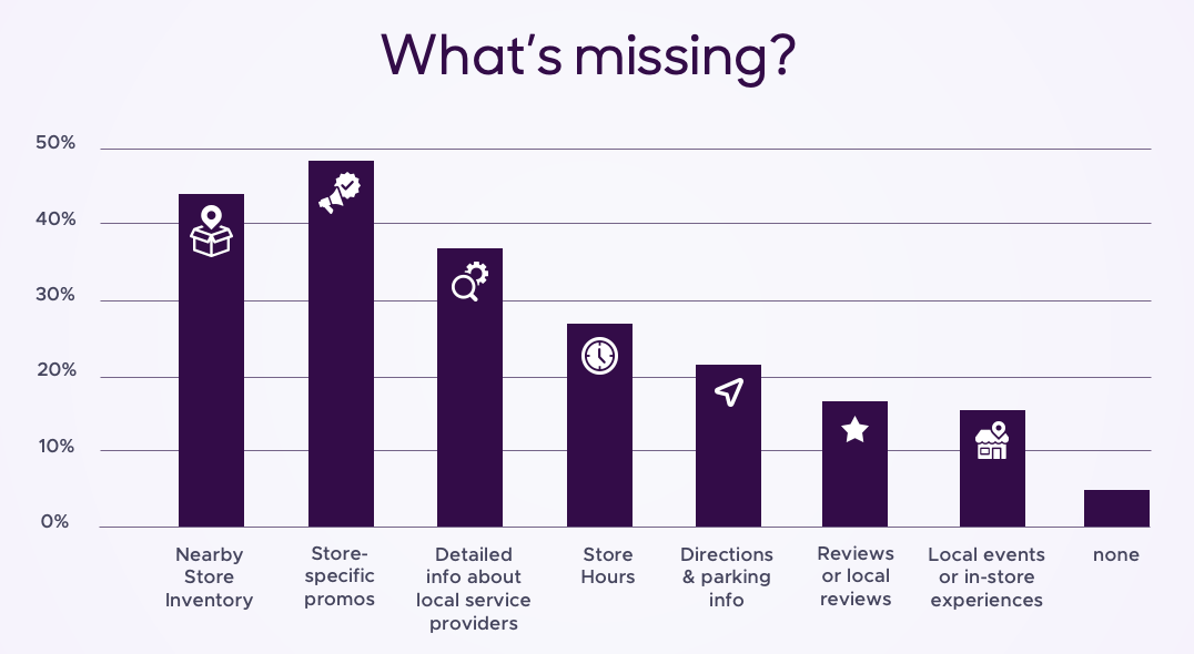 For those people who expressed mixed satisfaction or dissatisfaction with the AI local search/shopping experience, the survey asked what was missing? The absence of nearby store inventory was a prominent complaint.